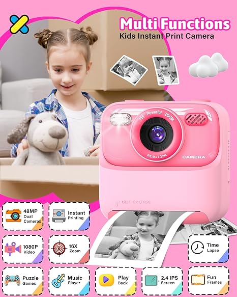 - Multifunctional Kids Digital Camera: The kids instant camera has rich features, including instant printing, capture colorful pictures and HD 1080p videos, 2.4 inch IPS screen,16x digital zoom, 3 puzzle games, flash, time-lapse, continuous shooting, playback, music player, 20+ filter frames etc. The design is compact and lightweight,and the buttons are simple to operate, making it easy for children to master.